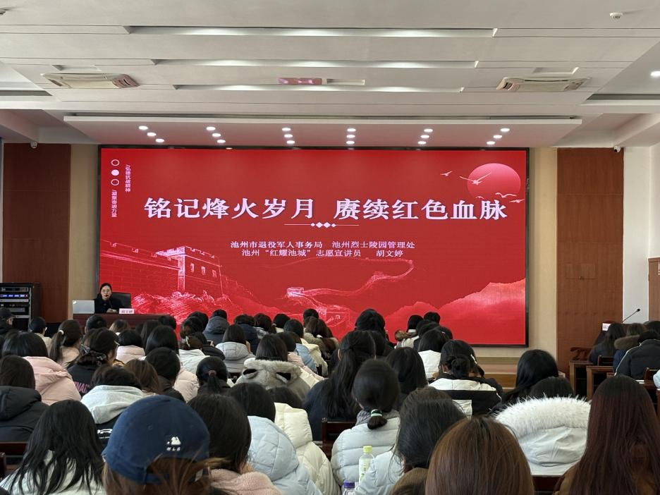 12月24日,思政部在图书馆五楼报告厅举办“汲取烽火力量照亮奋斗青春”红色主题讲座。本次讲座特邀池州市“红耀池城宣讲团”成员胡文婷、方小琴担任主讲,思政部全体专兼职教师与各系学生代表共同参加,一同聆听红色故事,感悟精神力量。