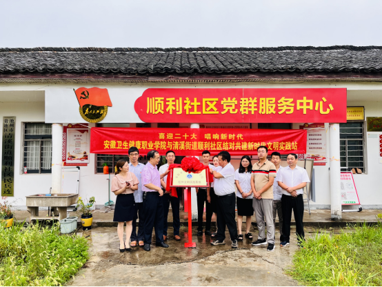 为贯彻落实中央、省委和池州市委关于建设新时代文明实践中心工作有关部署,推动新时代文明实践在基层落地见效,切实增强文明实践的吸引力、凝聚力、影响力,7月29日,学院在顺利社区举行了“安徽卫生健康职业学院校外文明实践基地”揭牌仪式,与清溪街道顺利社区结队共建新时代文明实践站。党委委员沈永康出席揭牌仪式。
