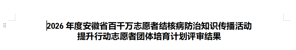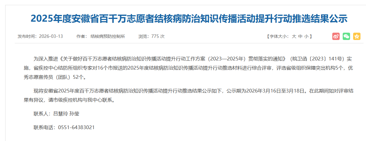 近日,2025年度安徽省百千万志愿者结核病防治知识传播活动提升行动推选结果及2026年度志愿者团体培育计划评选结果正式公布。我院雷锋志愿服务队获评省级“优秀志愿者团队”,青年志愿者协会申报的志愿培育项目荣获省级一等奖。